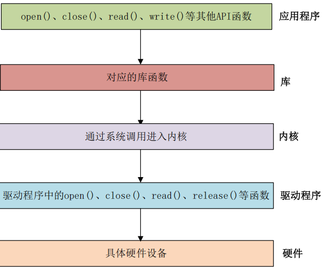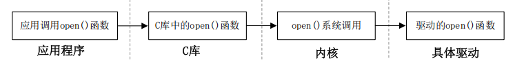 驱动加载后会在"/dev"目录下生成一个对应的文件,对其操作即可对硬件操作。Linux 驱动属于内核的一部分,因此驱动运行于内核空间,用户必须要通过系统调用才可以进入到内核。如open函数的操作流程如下所示:
