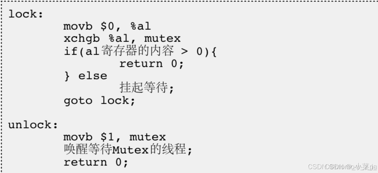 大多数系统都提供了swap或exchange指令,该指令的作用是把寄存器和内存单元的数据相交换,由于只有一条指令,保证了原子性, 即使是多处理器平台,访问内存的总线周期也有先后,一个处理器上的交换指令执行时另一个处理器的交换指令只能等待总线周期。
