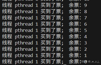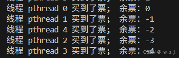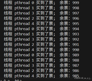 cpp#include<unistd.h> #include<iostream> #include<pthread.h> #include<string> using namespace std; #define NUM 5 int tickets=1000; class Threadd { public: Threadd(pthread_t id){ name="pthread "+to_string(id); } string name; }; void* Buy(void* args){ Threadd* da=static_cast<Threadd*>(args); while(tickets>0){ usleep(1000); cout<<"线程 "<<da->name<<" 买到了票; 余票:"<<--tickets<<endl; } } int main() { pthread_t tids[NUM]; Threadd* Date[NUM]; for(int i=0;i<NUM;i++){ pthread_t tid; Threadd* da=new Threadd(i); pthread_create(&tid,nullptr,Buy,(void*)da); tids[i]=tid; Date[i]=da; } for(auto e:tids) pthread_join(e,nullptr); for(auto e:Date) delete e; }但是结果并非如我们所期望的: