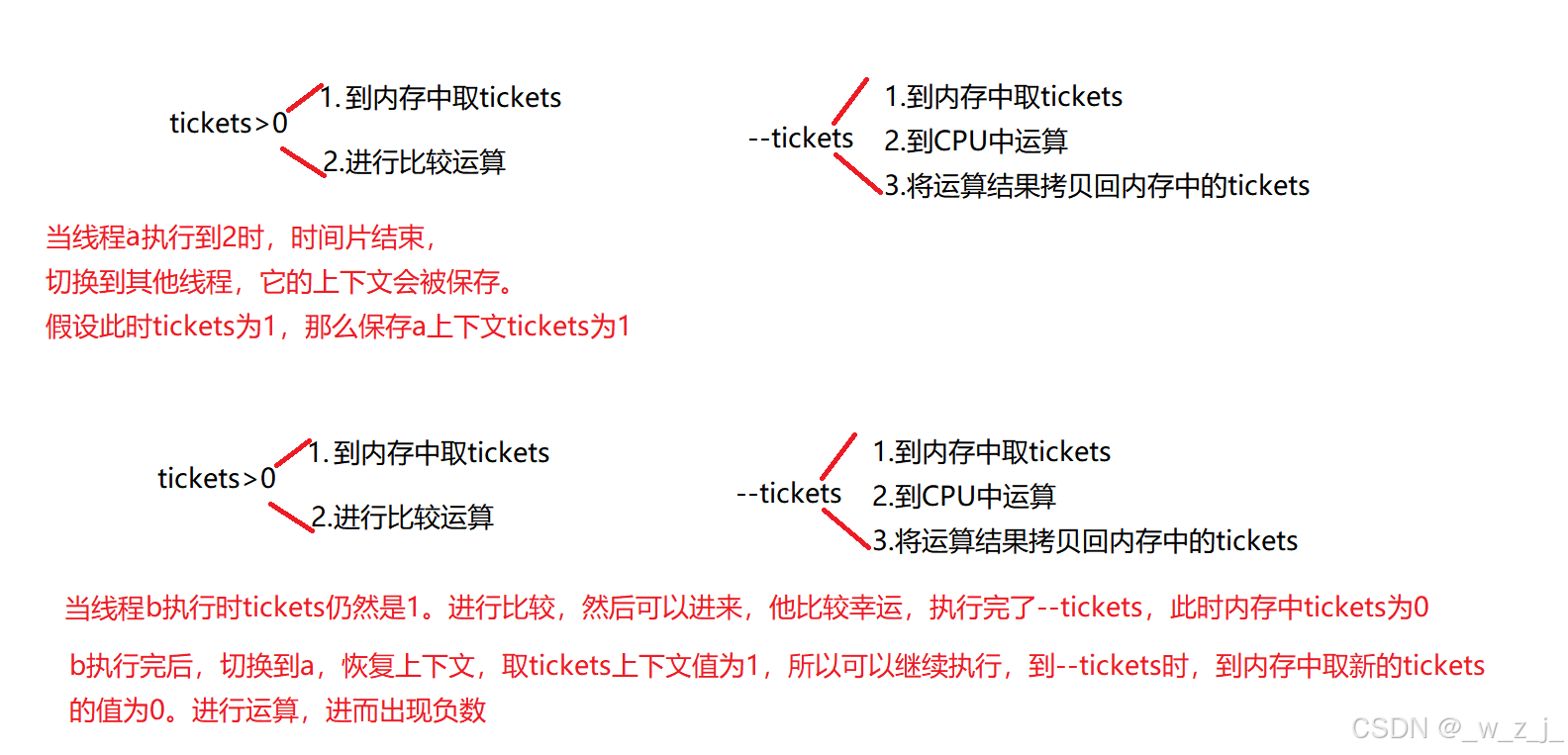 因为多线程同时执行 tickets>0 与 --tickets 时,这两个操作并不是原子的,它会被拆成"读取值→减一→写回"三个步骤以及"读取值,进行比较"。举个例子: