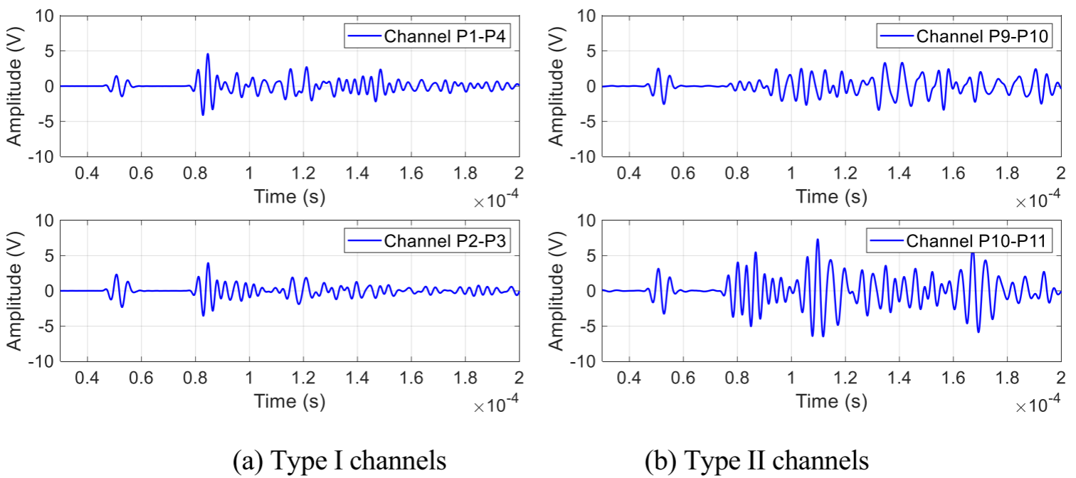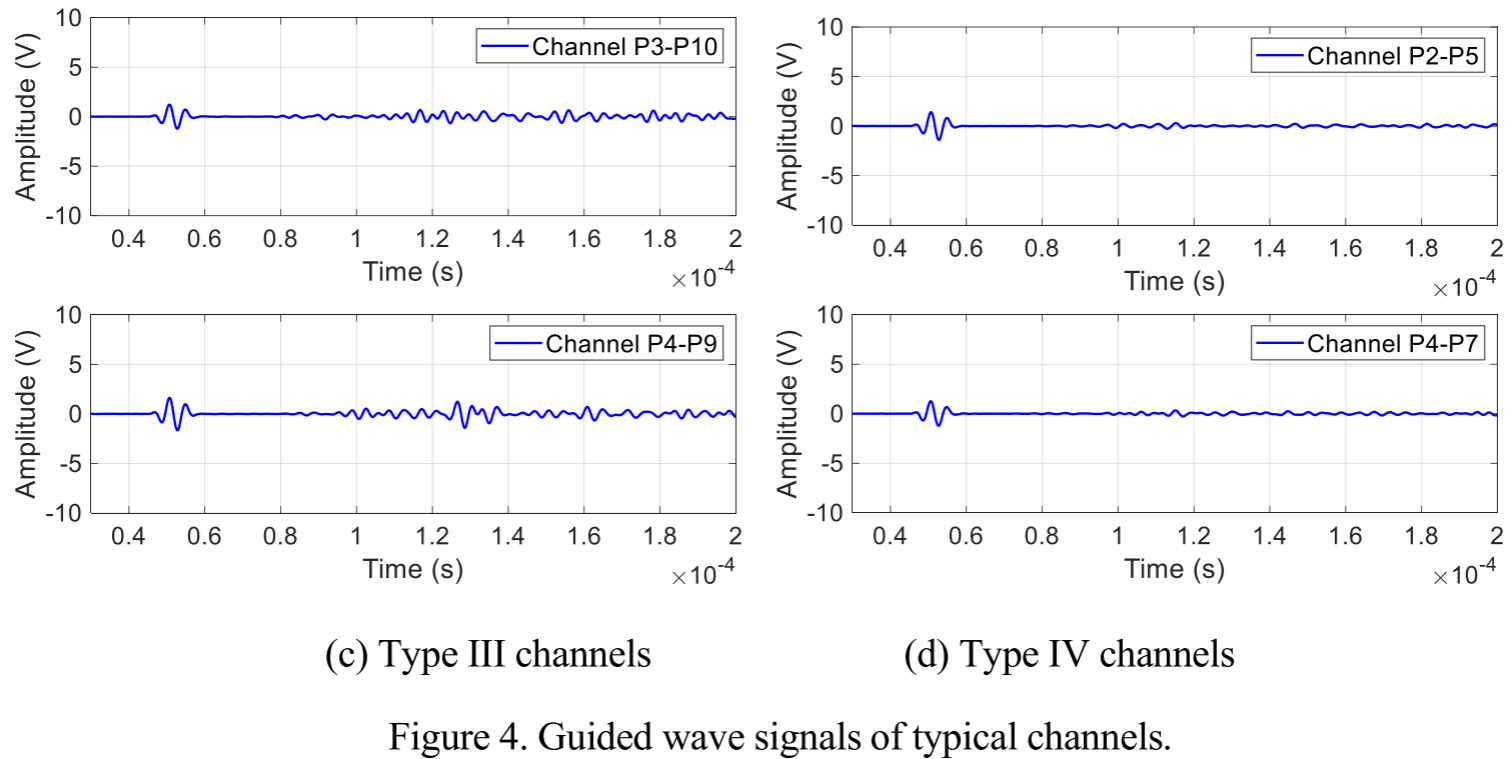 研究的核心创新之一是对不同类型信号通道的系统化分析。团队在结构上布置了多个压电传感器(PZT),形成了多条监测通道,并在230 kHz激励频率下进行了详细研究。