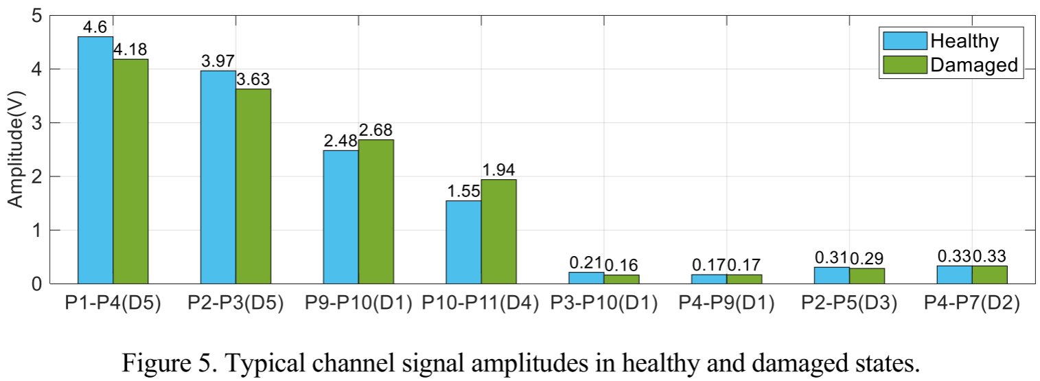 为了验证各通道的损伤识别能力,研究团队采用附加质量(胶带)模拟损伤,系统比较了健康状态与损伤状态下各通道的信号幅值变化。