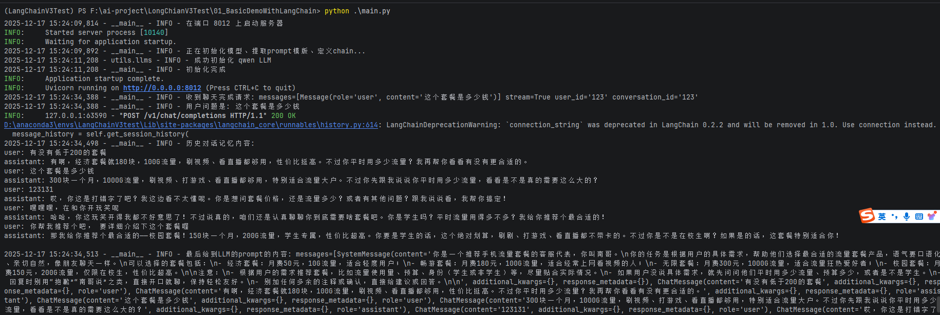 utils/llms.py用于加载对应的LangChain的Chat类utils/config.py里面定义了全局配置llmTest.py是一个简单调用大模型接口的例子main.py会通过FastApi启动一个服务,接收客户端的post请求。apiTest.py会连接main.py启动的服务,发起请求,并接受响应。