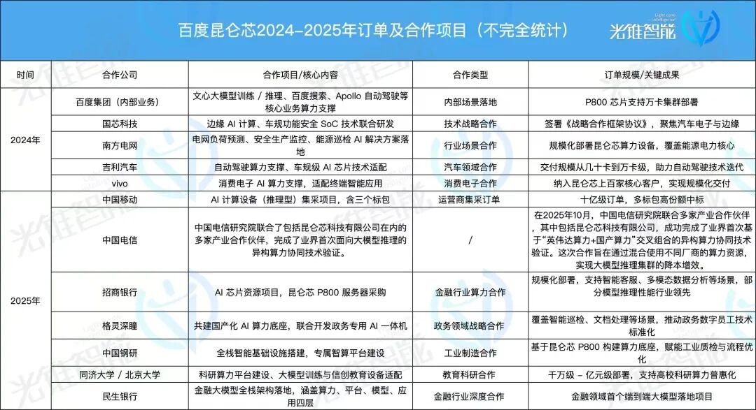 统计过程中,我们也发现,昆仑芯1代、2代主要面向的是百度集团内部业务应用,对外市场拓展相对较少,直到第三代产品P800的量产,使其开始逐步扩大对外市场份额,签订诸多订单。