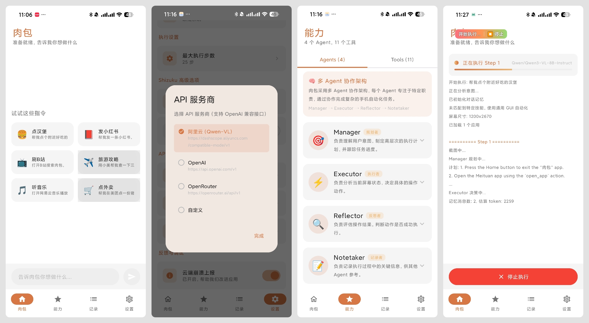 Roubao(肉包)是一款完全基于Android原生开发的AI自动化助手,打破了传统手机自动化依赖电脑运行和技术门槛高的痛点。用户只需安装一个App,配置API Key后即可通过自然语言指令让手机自主完成复杂任务。该应用利用视觉语言模型(VLM)和多Agent协作架构,使手机能够"看懂"屏幕内容并理解自然语言指令,智能决策并自动规划操作步骤。此外,它还支持多种VLM预设API服务商,提供高度可定制性和安全保障。精心设计的UI,现代化Material 3设计语言,流畅的动画效果,深色/浅色主题自适应,并有完整的中英文双语支持。高度可定制,支持多种VLM(如阿里云通义千问、OpenAI GPT-4V、Claude等),一键切换API提供商,支持模糊搜索和本地模型配置。API Key使用AES-256-GCM加密存储,检测到敏感页面时自动停止任务执行,全程可视并支持手动停止任务。支持Root模式,当Shizuku以Root权限运行时,Roubao可以启用更多系统级操作能力。