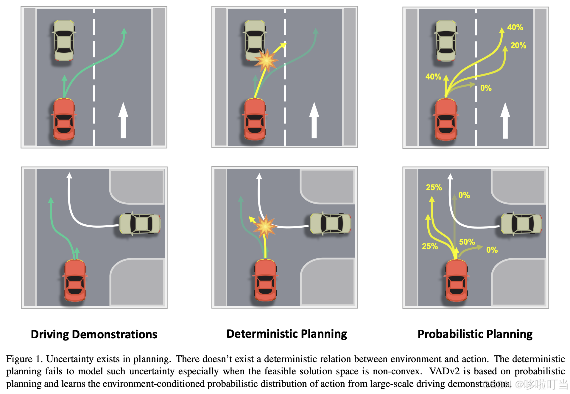 - 驾驶行为的不确定性:同一环境下人类驾驶员可能有多种合理决策(如跟车时可保持车道或超车、会车时可让行或超车),且受大量潜在因素影响,不存在 "环境→动作" 的确定性映射。