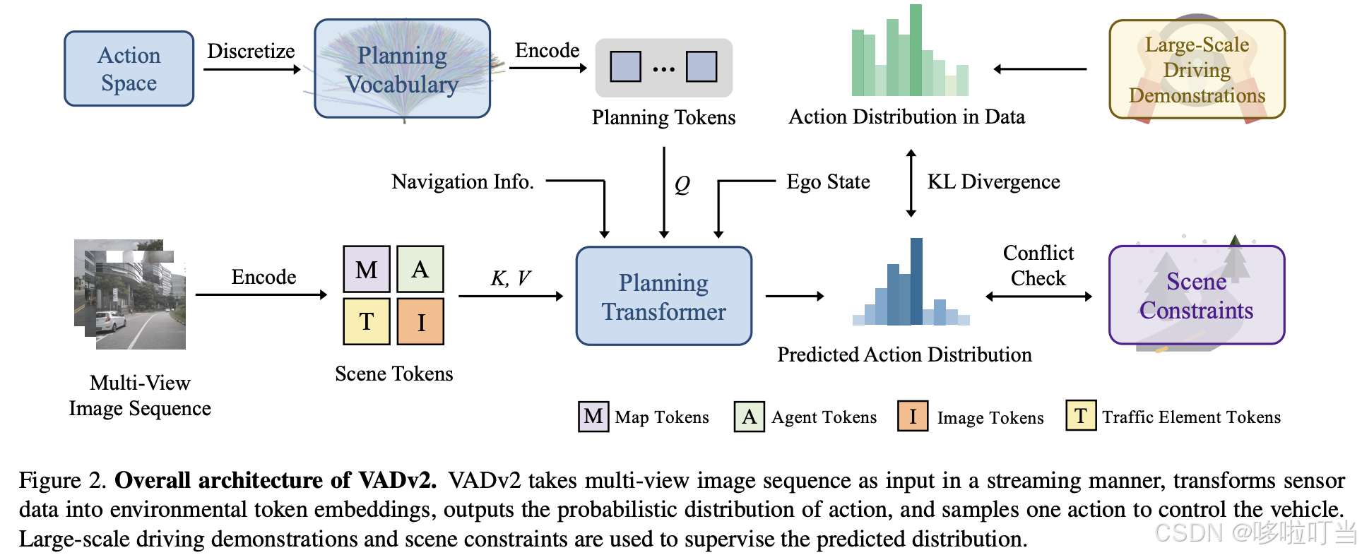 VADv2 的整体框架是 "输入多视角图像序列→编码环境特征→输出动作概率分布→采样动作控制车辆",核心模块包括 3 部分: