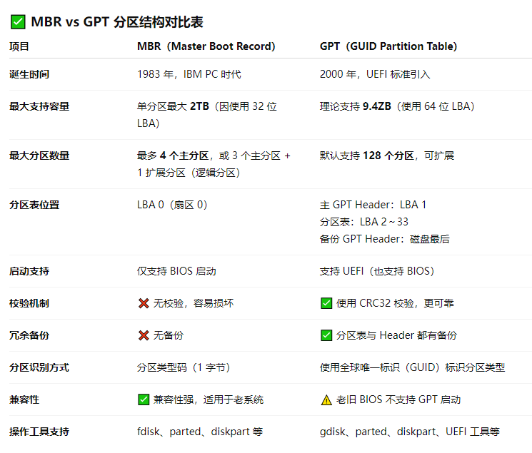 - 容量限制: MBR 最大只能支持 2TB 的硬盘容量。对于任何大于 2TB 的存储空间,MBR 将无法寻址。