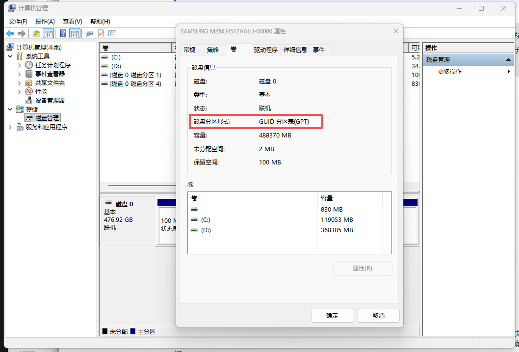 在 Windows 中可以在磁盘管理中右键磁盘查看属性,在卷选项卡中能够看到磁盘分区格式: