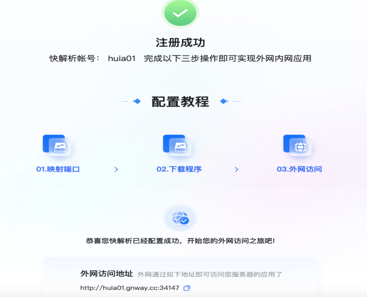 您会发现快解析为您提供了一个对外访问地址,外网使用人员即可通过快解析提供的地址访问系统了