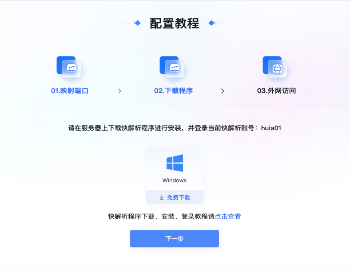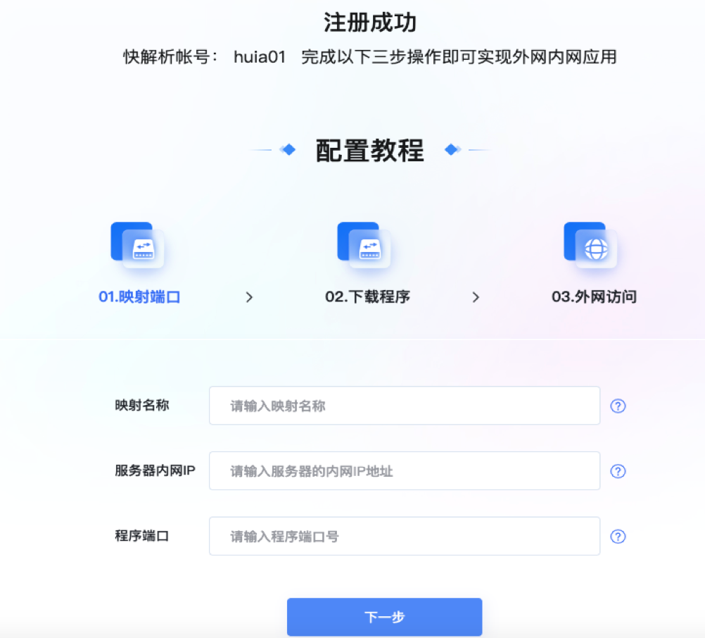 账号注册成功后,按照步骤完成映射端口、下载程序安装登录、外网访问,即可实现外网应用了,第一步:填写映射信息,映射名称自定义、内网IP就是服务器的局域网IP地址,程序端口是您应用程序的通信端口,填写完毕后点击下一步