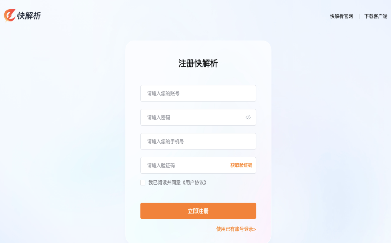 您只需要打开快解析官网,点击右上角注册按钮