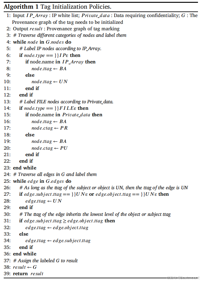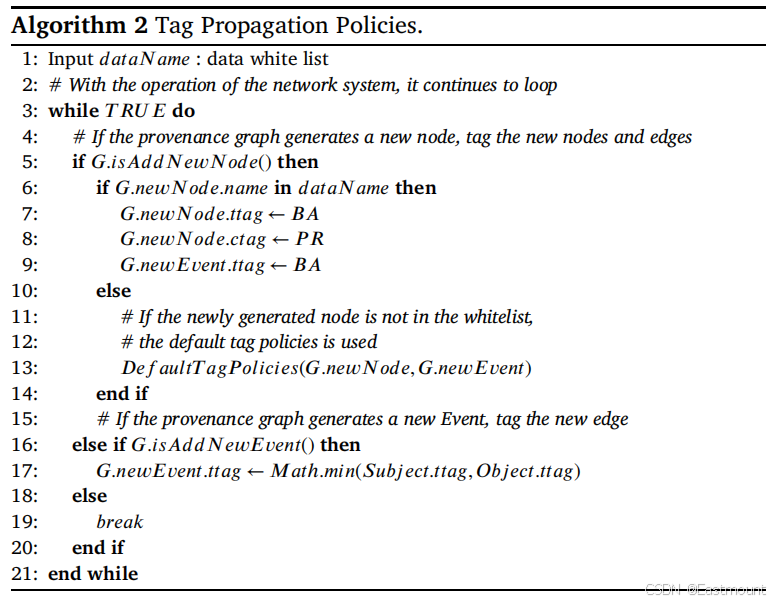 - (2)新增节点处理:若新节点名称存在于数据白名单中,则将其标记为可信标签 ttag = BA,内容标签 ctag = PR,并对其相关新事件赋予 ttag = BA。若不在白名单中,则调用默认标签策略DefaultTagPolicies 进行处理。