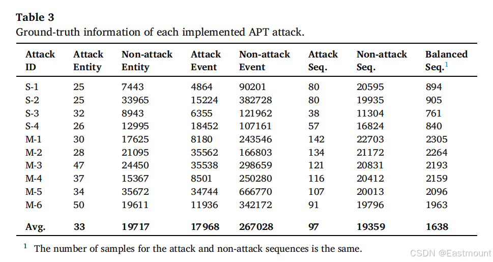 表3揭示了原始审计图中攻击行为的稀疏性和数据极度不平衡问题,说明模型训练前必须采用序列提取和样本平衡策略,以确保能有效学习到攻击行为特征。