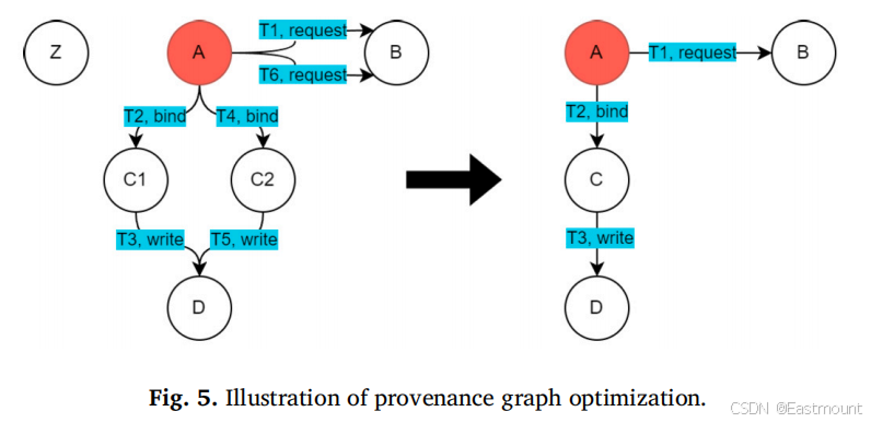 - 语义重复实体的融合:A → C1 → D 和 A → C2 → D 表示两个语义相同的中间过程(如两个子进程写同一个文件),在右图中合并为单一链路 A → C → D。