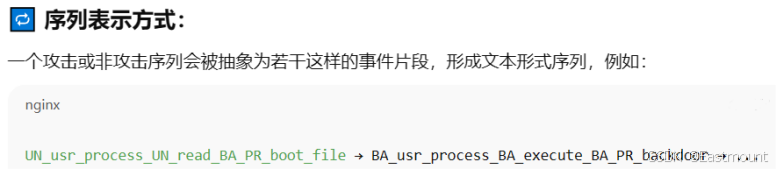 - 图 B 将溯源图中的攻击事件抽取为时间有序的操作序列,每步包含操作动作和实体标签(如 BA 表示后门,PR 表示特权)。这种结构便于模型理解攻击的语义过程,是训练攻击检测模型的核心输入形式。