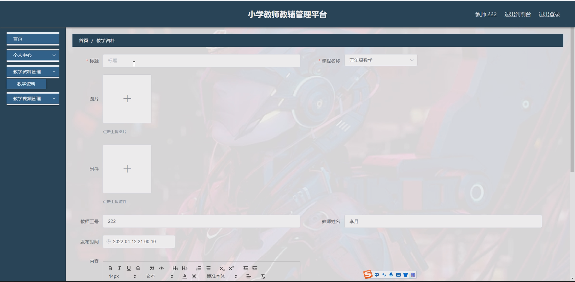 当前小学教学中,教师教辅管理普遍存在"资源分散、管理低效"的问题:教学资料(课件、习题)多以本地文件存储,易丢失且共享困难;教学视频、动画等可视化资源缺乏系统分类,查找耗时;课程表、师生关联信息与教辅资源脱节,难以实现"课-人-资源"的精准匹配。传统教辅管理模式不仅增加教师工作负担,还制约了教学资源的高效利用。