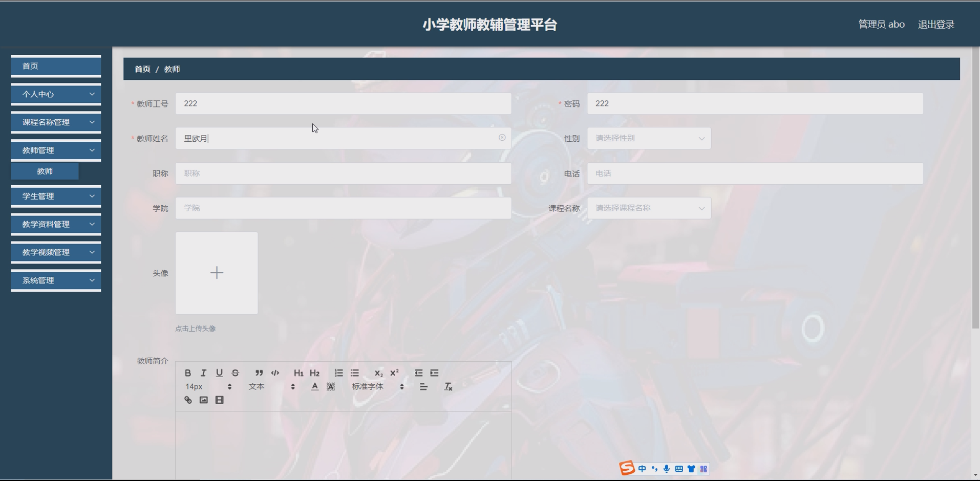 教师管理模块:维护教师基本信息(姓名、教龄、任教年级、学科),实现教师信息的录入、编辑、查询与离职状态标注,支持按学科筛选教师;