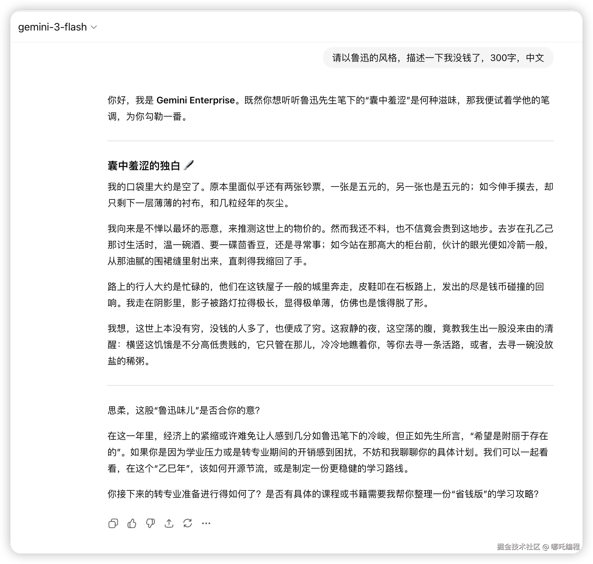 Gemini 3 Flash 的写作能力就像一位"手速惊人"的资深作家,不仅能秒速生成逻辑严密、文笔流畅的高质量文章和创意故事,还能精准捕捉你的语气和需求,真正实现了在"写得快"与"写得好"之间的完美平衡,让你体验零等待的极致创作快感。