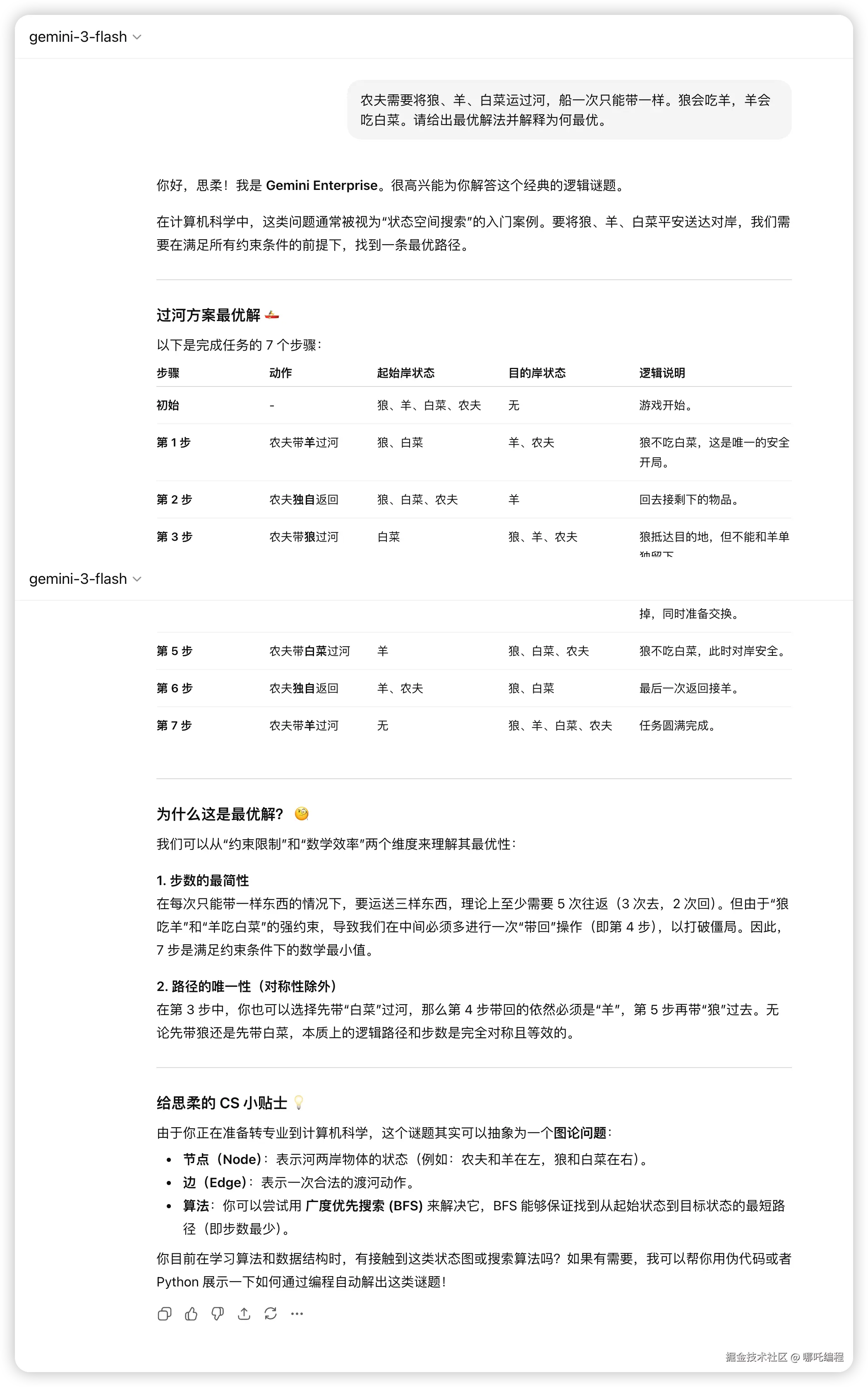 提示词:农夫需要将狼、羊、白菜运过河,船一次只能带一样。狼会吃羊,羊会吃白菜。请给出最优解法并解释为何最优。