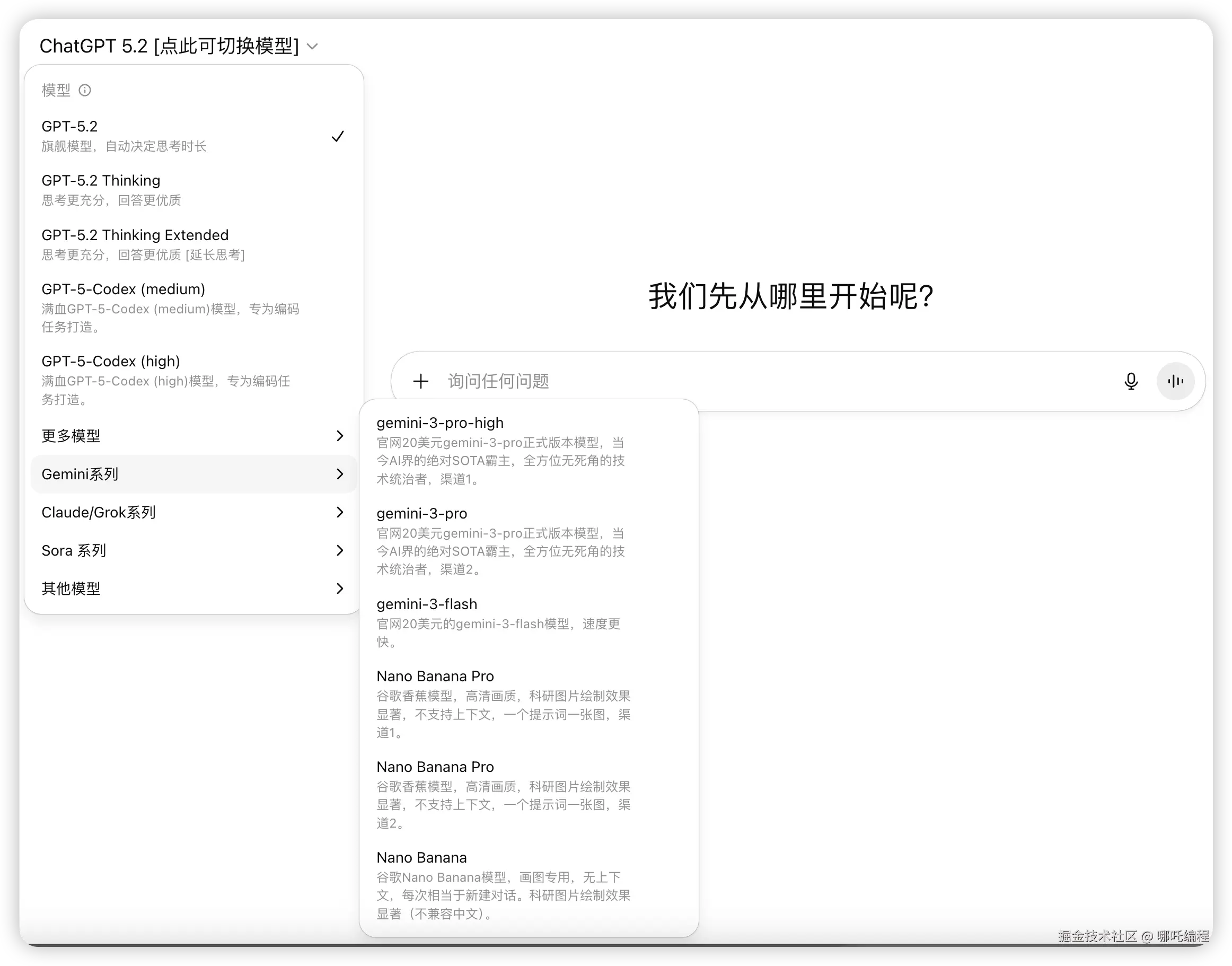 包含GPT-5.2、GPT-5.2 Thinking、Gemini 3 Pro、Gemini 3 Flash、香蕉🍌Nano Banana Pro、Claude Sonnet 4.5、Codex、Sora2、Grok4.1等模型。