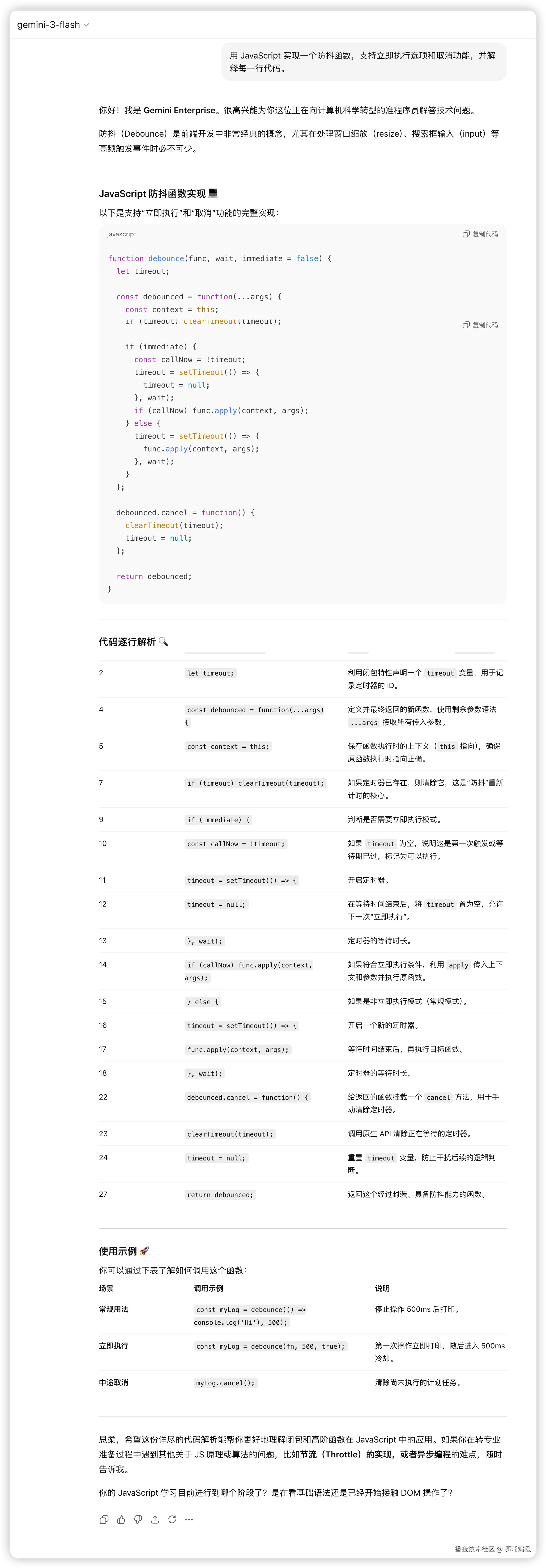 提示词:用 JavaScript 实现一个防抖函数,支持立即执行选项和取消功能,并解释每一行代码。