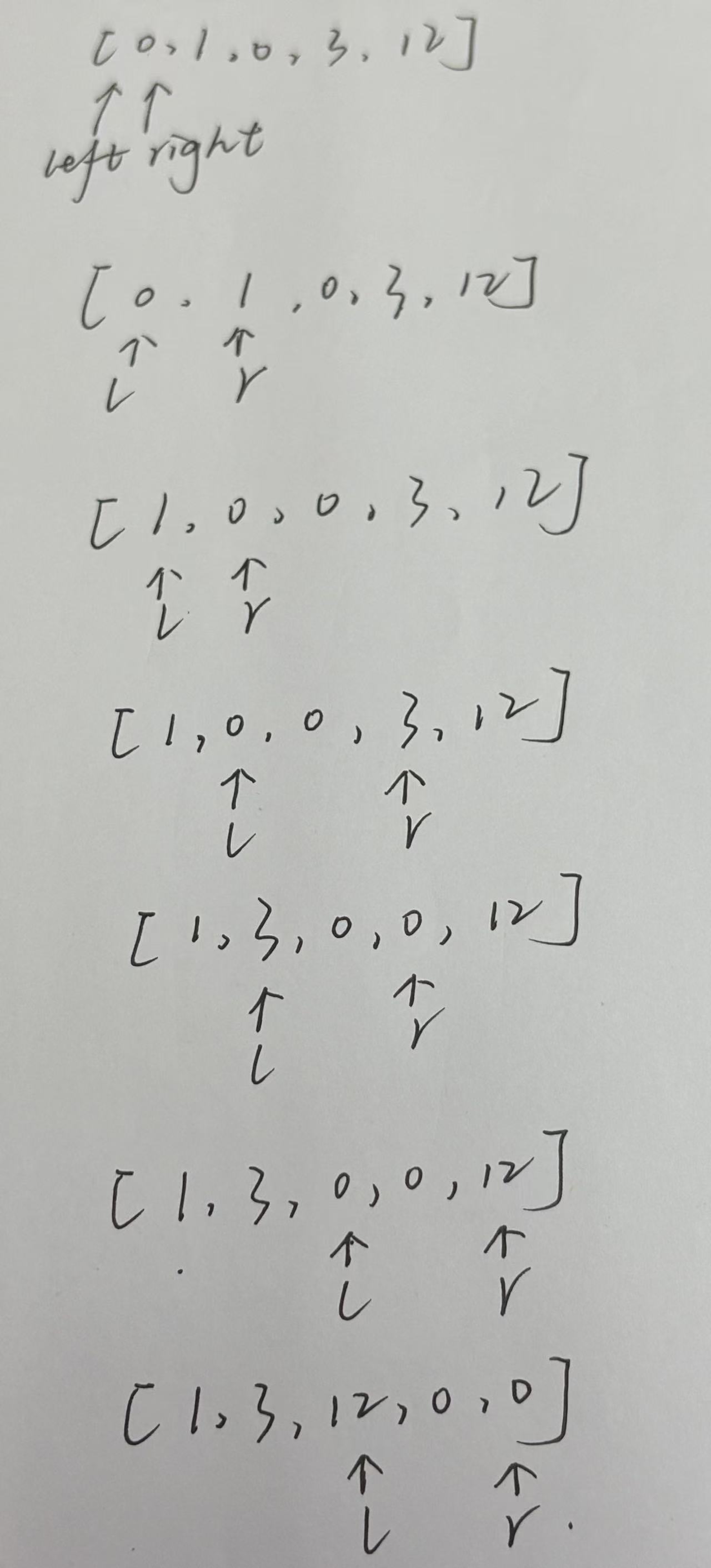 这一题很巧妙的点在于用双指针可以互换数组里面数字的位置,可以自己画一下图理解一下。
