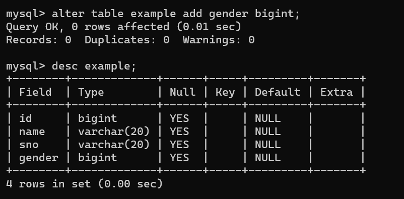 alter table example add gender bigint;