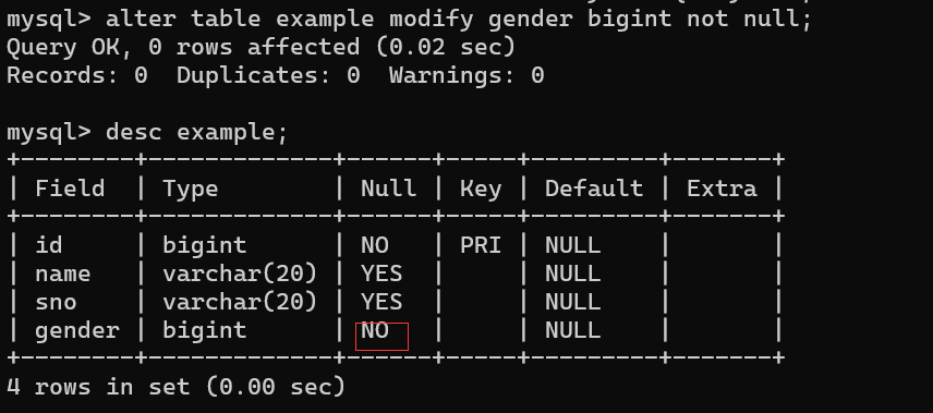 alter table example modify gender bigint not null;