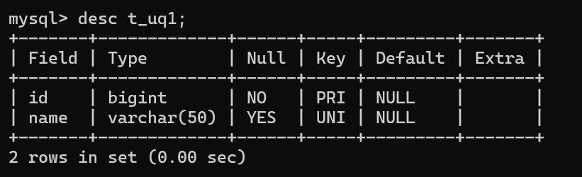 2.在创建表时,单独指定唯一键