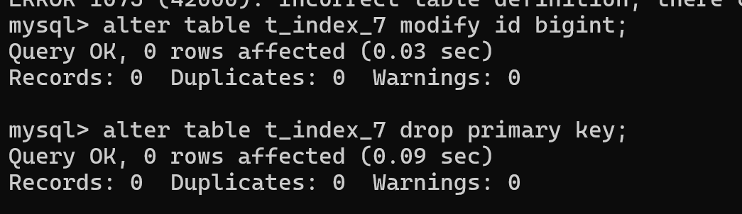如果主键索引对应的列是auto_increment,首先要将该列修改为不是auto_increment