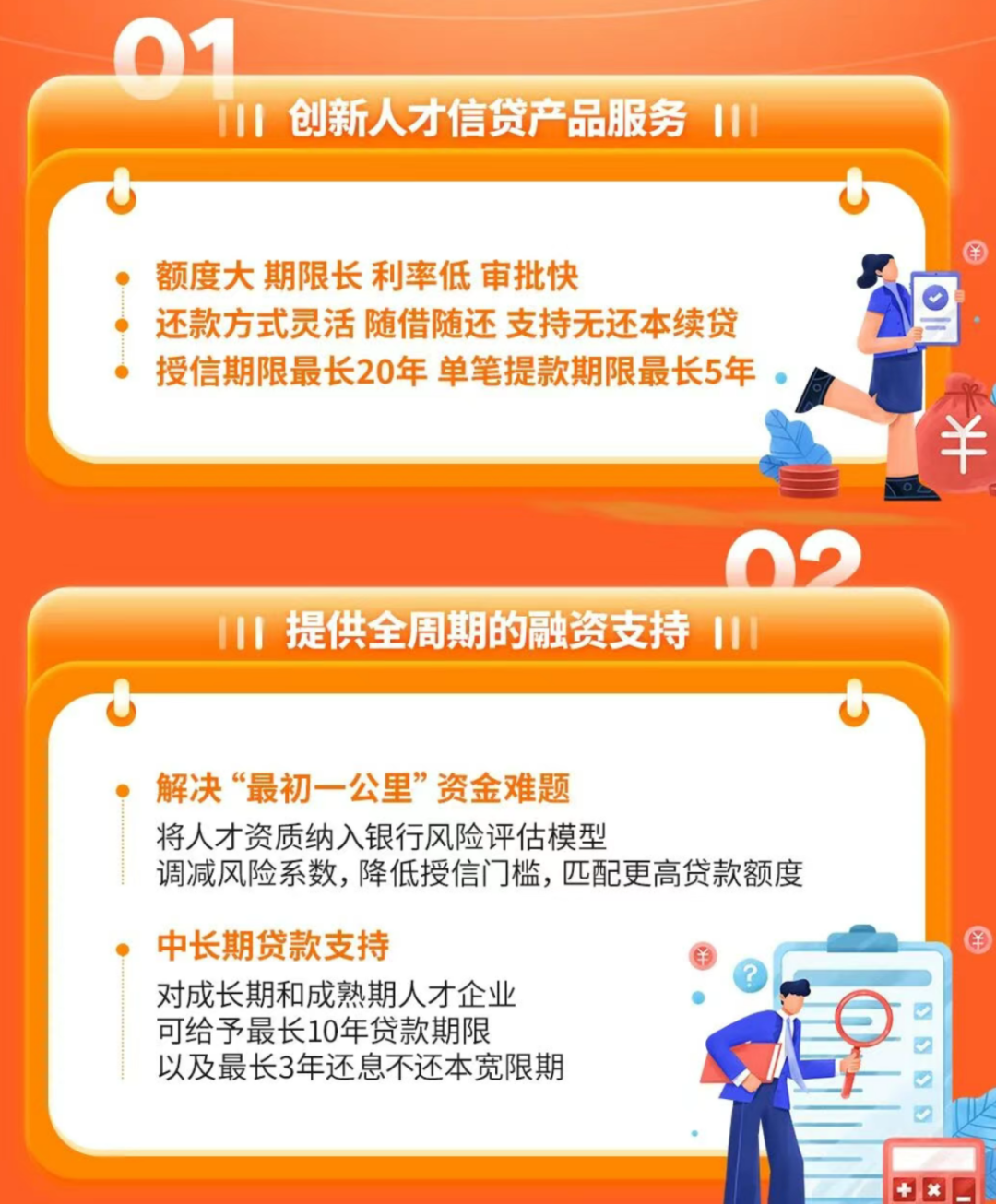 "人才贷""人才保""人才担"等服务根据人才需求展开,却又相互衔接:一端是额度大、期限长、利率相对优惠、审批效率高的信贷产品,配合"随借随还"、授信期限内循环使用、最长 20 年授信、单笔最长 5 年使用、符合条件可无还本续贷等安排,为创业者打通相对稳定的资金渠道;