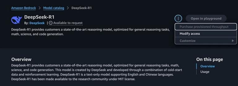 部署前,需要在Amazon Bedrock控制台申请访问DeepSeek R1模型。打开Bedrock主页,点击模型列表中的DeepSeek R1,选择 "Modify Access" 并提交申请。