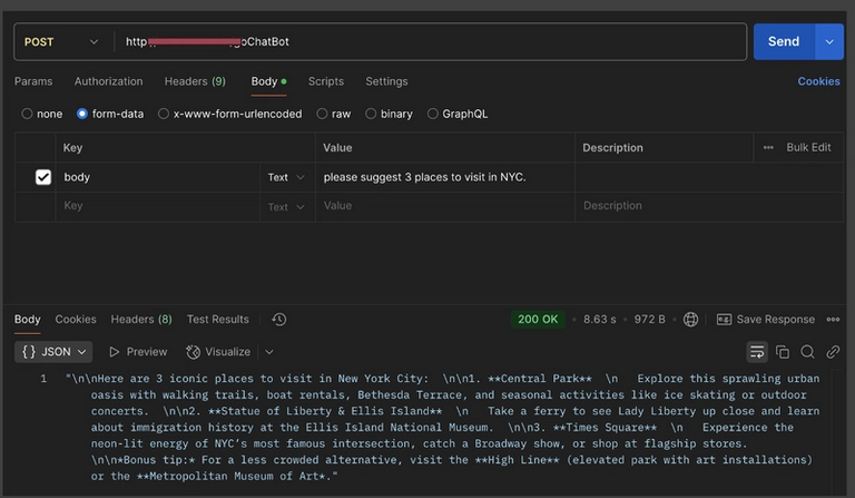 部署成功后,可通过Postman或curl验证服务响应。发送POST请求: