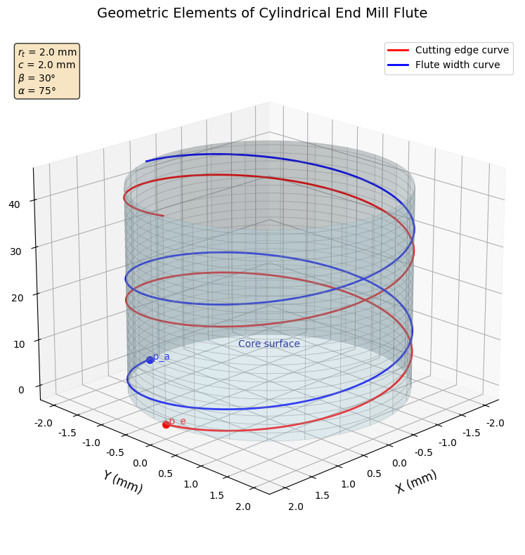 ax.set_title('Geometric Elements of Cylindrical End Mill Flute', fontsize=14, pad=20)