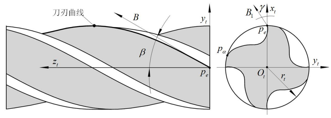 螺旋角 β \beta β定义为轴向平面刀刃曲线在 p e p_e pe点处的切向量 B B B与 z t z_t zt轴之间的夹角,满足: