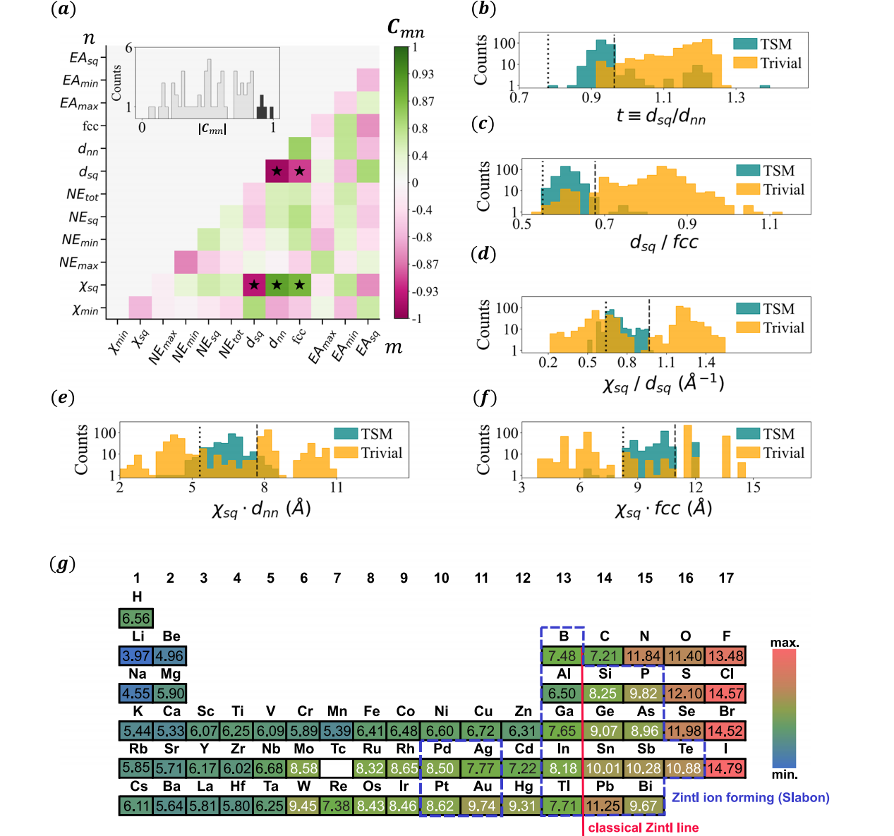 b d sq / d nn d_{\text{sq}}/d_{\text{nn}} dsq/dnn、c d sq / fcc d_{\text{sq}}/\text{fcc} dsq/fcc、d χ sq / d nn \chi_{\text{sq}}/d_{\text{nn}} χsq/dnn、e χ sq ⋅ d nn \chi_{\text{sq}} \cdot d_{\text{nn}} χsq⋅dnn、f χ sq ⋅ fcc \chi_{\text{sq}} \cdot \text{fcc} χsq⋅fcc在数据集中拓扑半金属(TSM)与平庸材料中的取值;竖线标记了支持拓扑半金属的新兴描述符的取值范围。