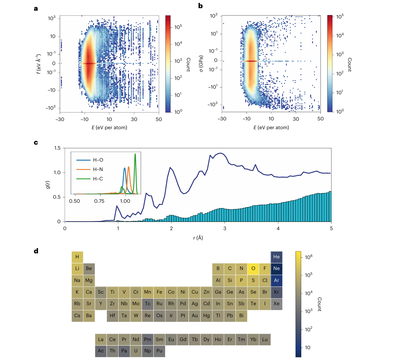 d,数据集中所有原子的元素计数,覆盖了元素周期表中的89种元素。