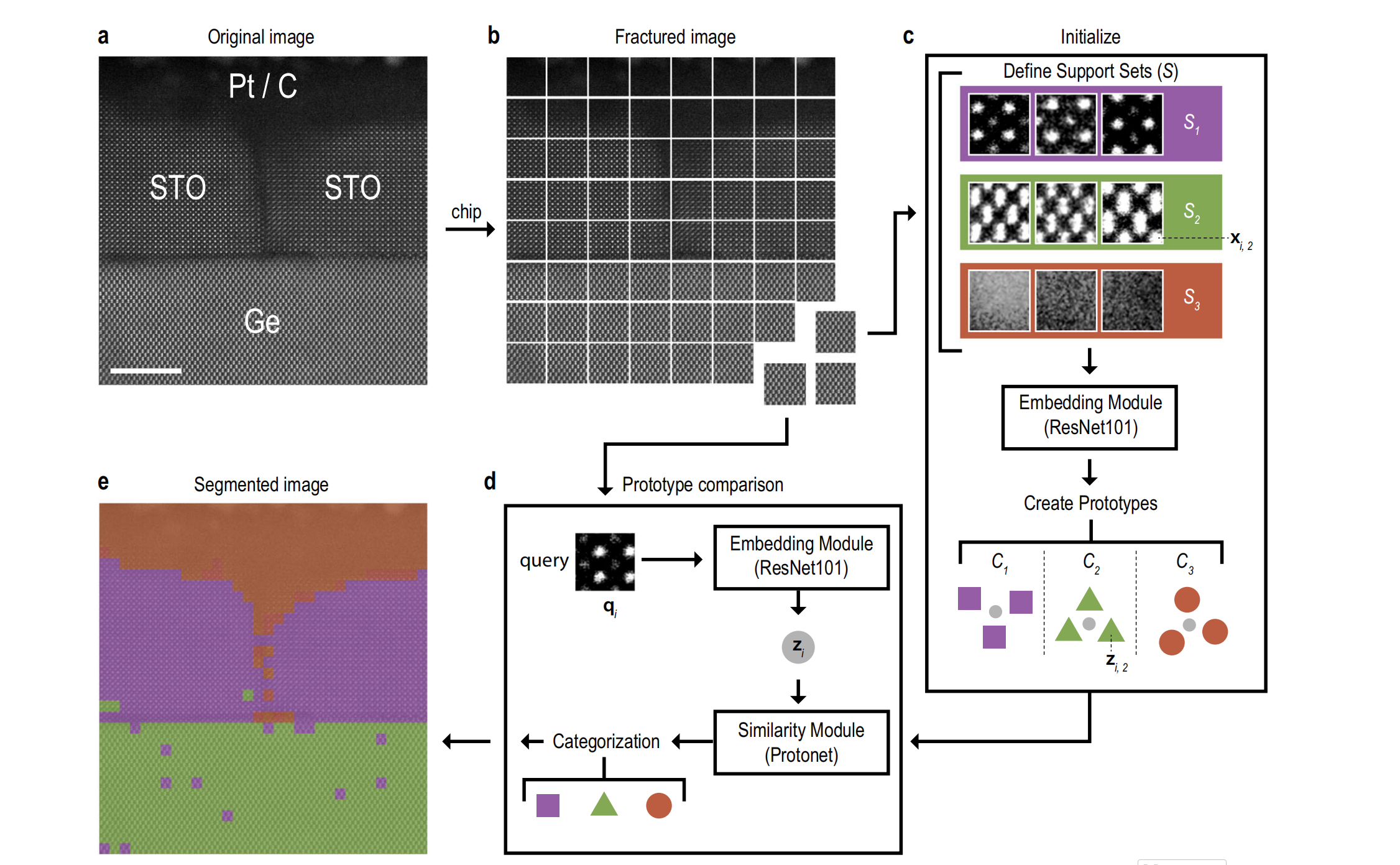 原始STO/Ge图像(a)被拆分为若干子图像芯片(b);选取少量芯片在"支持集"中代表目标分割类别(c);每个芯片作为查询样本,与支持集定义的"原型"(d)通过欧氏距离对比分类,最终得到分割图像(e)。比例尺:5 nm。