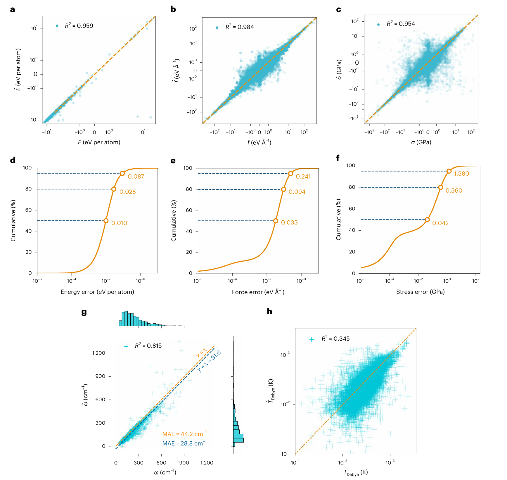 a--c,能量( a a a)、力( b b b)和应力( c c c)的一致性图。模型预测结果记为 E ^ \hat{E} E^、 f ^ \hat{\mathbf{f}} f^和 σ ^ \hat{\boxed{\sigma}} σ^;虚线( y = x y = x y=x)为参考线。