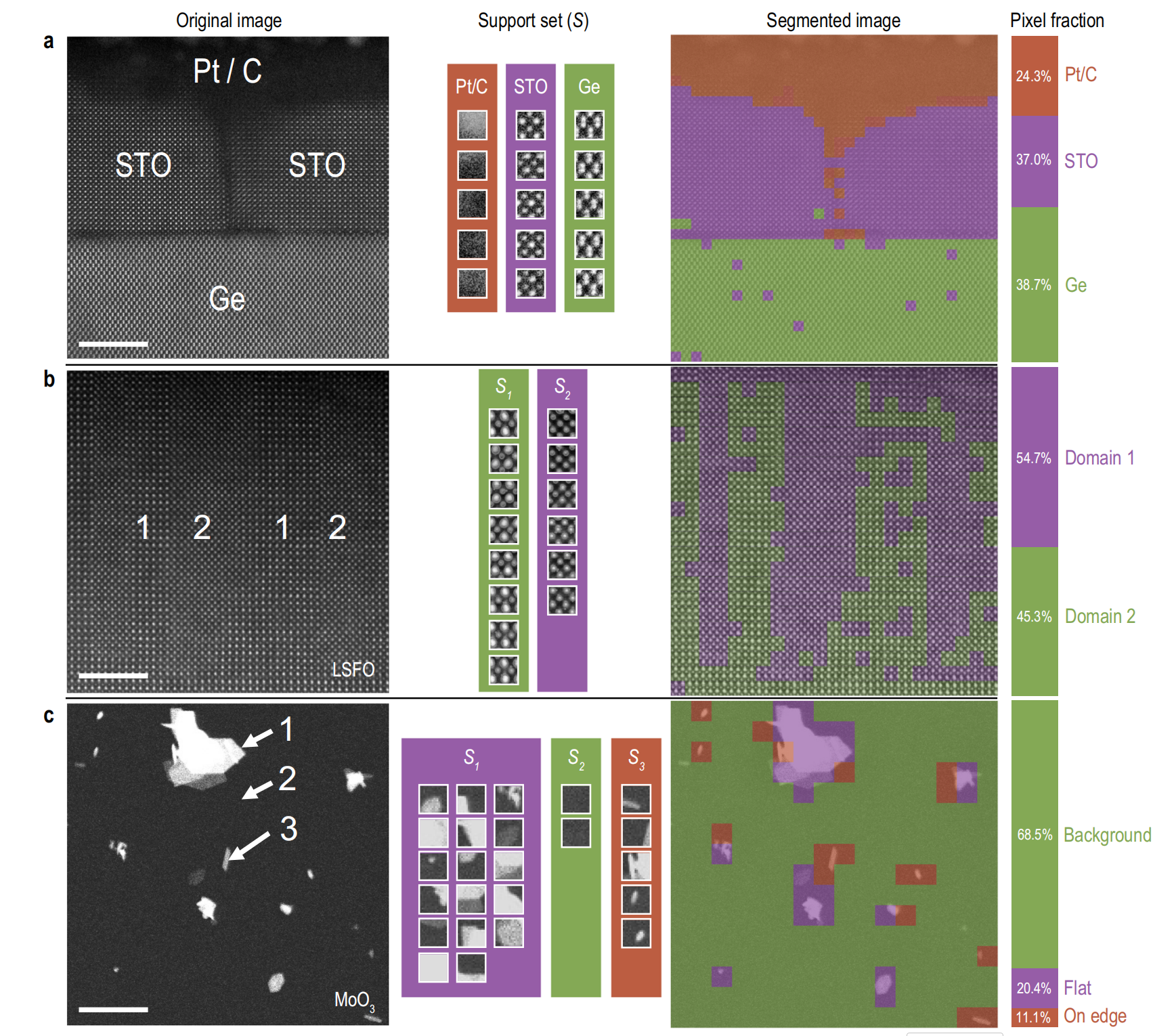 a--c 对三种材料体系(STO/Ge、LSFO、MoO₃)的分析:依次展示了原始图像(左)、对应的支持集(中),以及少样本分割的输出结果(右);每个体系中各支持集类别的占比估算值,呈现于对应子图的插图条形图中。比例尺: a -- b a--b a--b为5 nm, c c c为5 μm。