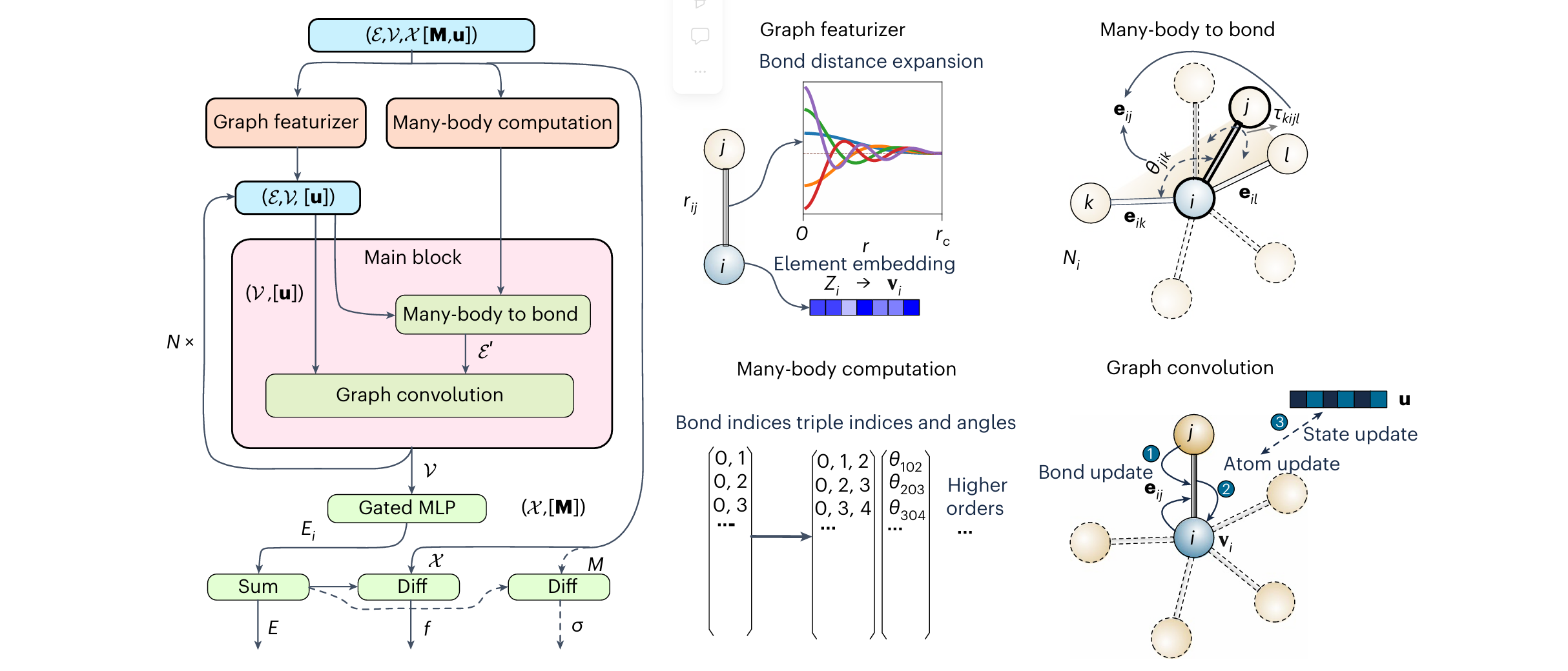 模型开发借鉴了传统原子间势的思想,例如Tersoff键序势²⁵:通过原子 i i i的近邻 j j j、 l l l的所有键组合(排除 i i i和 j j j),纳入 n n n体相互作用。本文中,我们用图神经网络生成高阶相互作用(如键角、二面角),并将其与图相互作用聚合,随后将这些信息传递至标准图卷积步骤。