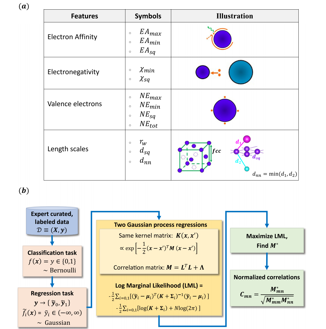 b ME-AI的流程图解。我们首先构建预处理并标注的数据集 D ≡ ( X , y ) \mathcal{D} \equiv (X, y) D≡(X,y):其中包含12个核心特征( X = ( x 1 , . . . , x N ) X = (x_1, ..., x_N) X=(x1,...,xN), x n ∈ R D x_n \in \mathbb{R}^D xn∈RD, D = 12 D=12 D=12),以及对应的类别标签( y = ( y 1 , . . . , y N ) y = (y_1, ..., y_N) y=(y1,...,yN), y n ∈ { 0 , 1 } y_n \in \{0,1\} yn∈{0,1});下标(n)代表数据集中的不同材料(共 N N N个条目)。将分类任务转化为两个独立的回归任务后,我们基于共享核函数 K ( x , x ′ ) K(x, x') K(x,x′)搭建了两个高斯过程回归(GPR)模型。