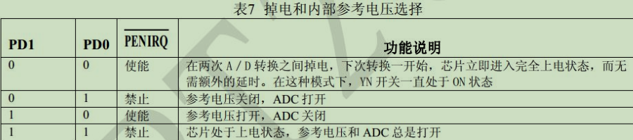 PD1、PD0:是指令里的两个 "开关位"(像遥控器的两个按键);$\overline{PENIRQ}$:可以理解为 "触摸提示功能"(使能 = 打开提示,禁止 = 关掉提示);- "功能说明" 是不同开关组合下,芯片的省电程度 和参考电压 / ADC 的开关状态。