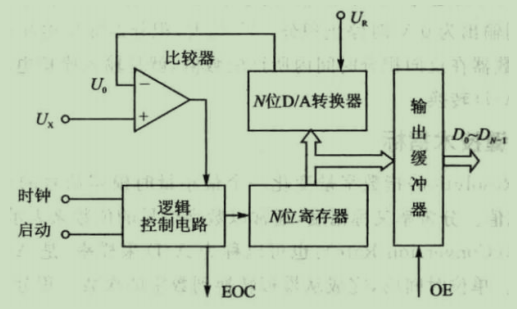 采用逐次逼近法的 AD 转换器是有一个比较器、DA转换器、缓冲寄存器和控制逻辑电路组成