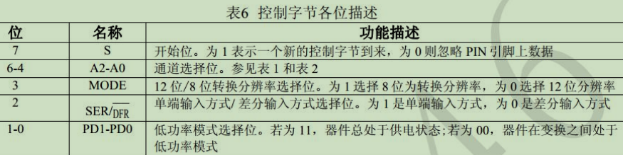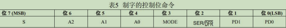 在对 XPT2046 进行控制时,控制字节由 DIN 输入的控制字命令格式如下所示: