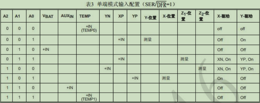 表 3 是单端模式 (SER/DFR=1,控制指令里的一个 "开关位",设为 1 就用单端模式)------ 入门常用,直接测某一个引脚的电压;