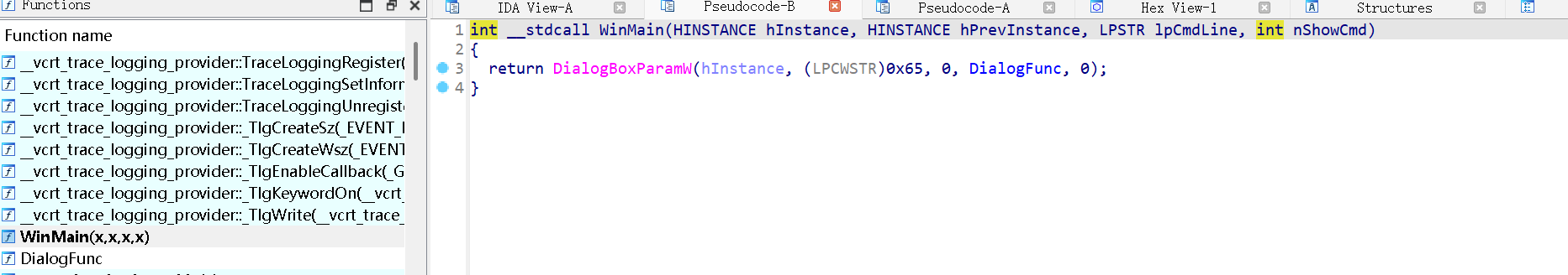 WinMain里的DialogFunc(IDA 会跳转过去) -