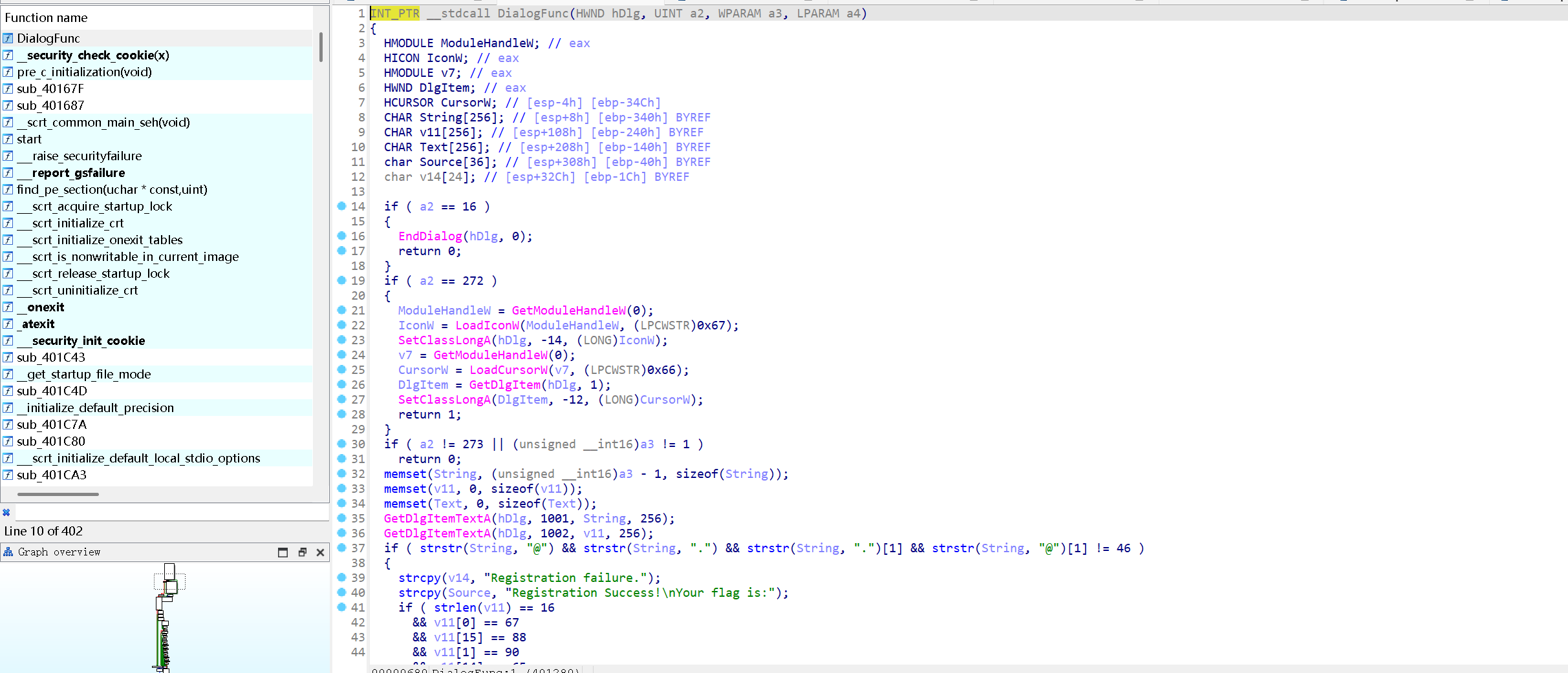 WinMain 直接调用了 DialogBoxParamW,说明这是一个基于对话框的 GUI 程序 。关键逻辑在 DialogFunc 这个对话框过程函数里。