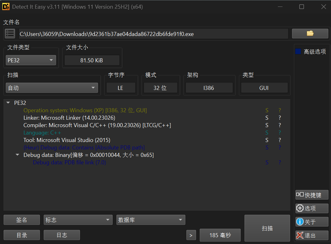 包含PDB调试信息:是(有绝对路径PDB)